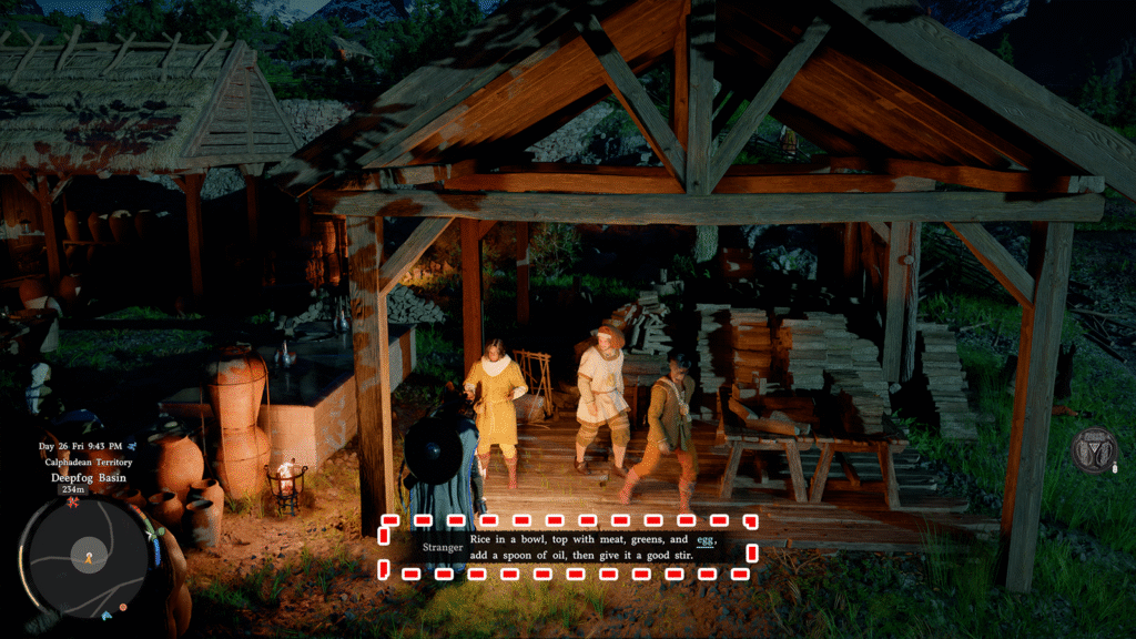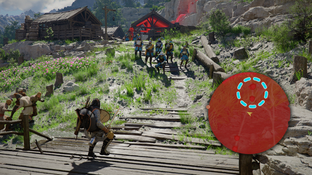 انتبه لوجود شخصيات NPC تظهر كنقاط بيضاء على الخريطة المصغّرة (Mini Map). غالبا ما تكشف هذه الشخصيات معلومات مفيدة، مثل موارد لم تكتشفها بعد، أو أسرار قريبة، أو تحديات، أو مهام، وغير ذلك. أحد الأمثلة التي صادفناها كان رجلا عجوزاً يصرخ على طريق قرب Springtide Mill، يتحدث عن توهج غريب يظهر على جبل قريب أثناء الليل.