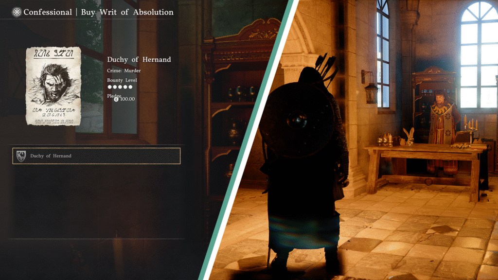 يمكنك سداد المكافآت والغرامات عن طريق زيارة أماكن الاعتراف في الكنائس (Church Confessionals) الموجودة في أنحاء Pywel. هناك، يمكنك زيارة متجر الاعتراف (Confessional Shop) واختيار خيار “Buy Writ of Absolution“، والذي سيعرض جميع المكافآت النشطة في مختلف المناطق. سدد المكافأة أو الغرامة، وسيتم مسح اسمك من جميع الجرائم.