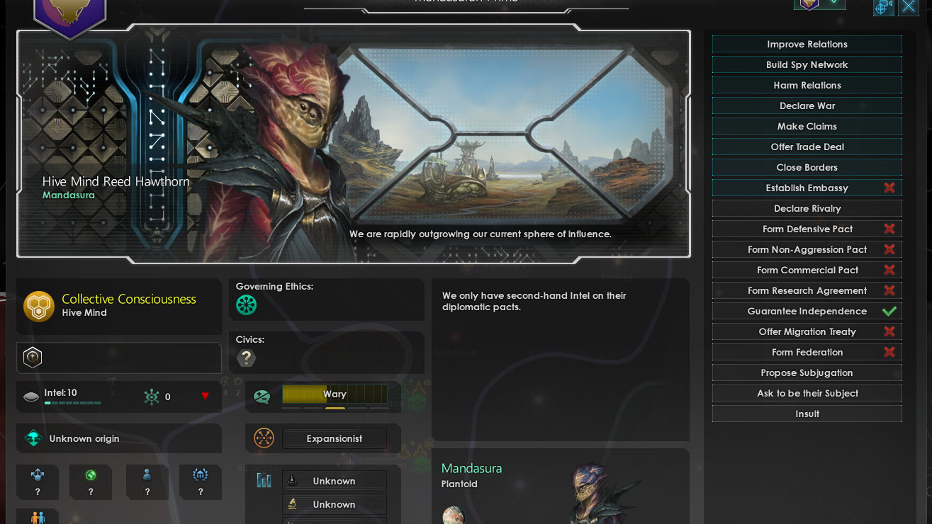 هذا يغير أسلوب اللعب جذرياً، حيث تركز على الكفاءة المطلقة والنمو السريع دون القلق بشأن المتطلبات الفردية للسكان. اللعبة تضعك في مكان الرأس لهذا العقل الجمعي، مما يجعلك ترى الأجناس الأخرى الفردية ككائنات ضعيفة ومشتتة بسبب نزاعاتها الشخصية.