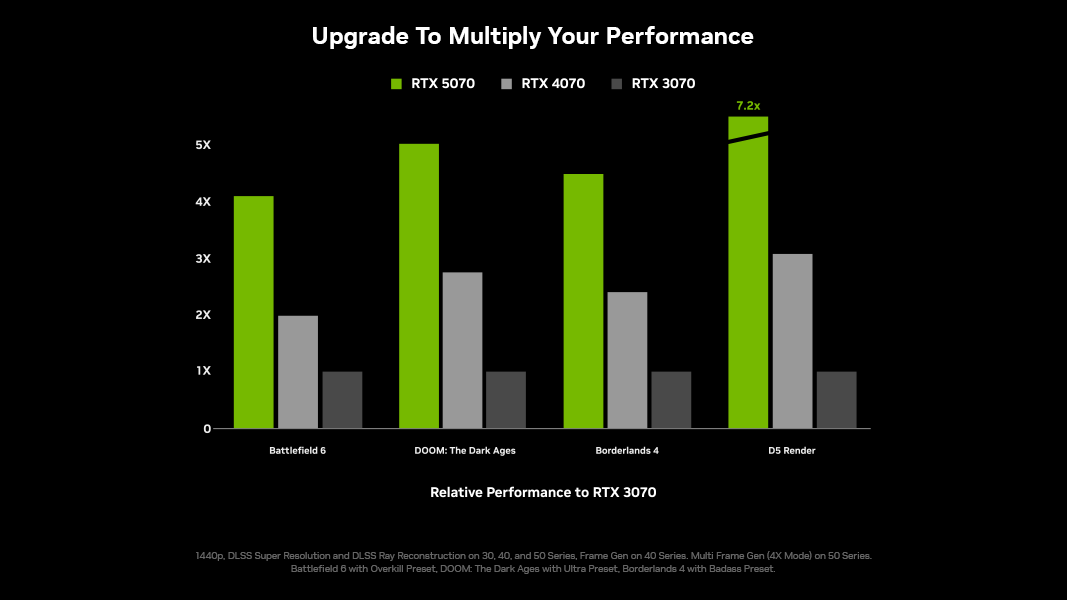 وتظهر قوة هذا الجيل بوضوح عند تشغيل الألعاب المتطلّبة، إذ تقدم تقنيات مثل DLSS 4 دفعة كبيرة في الأداء تصل إلى 5 أضعاف، مما يمنح اللاعبين سلاسة غير مسبوقة في معدل الإطارات. كما يرفع الجيل الثالث من أنوية تتبع الأشعة مستوى الإضاءة والانعكاسات ليصل إلى دقة أقرب ما تكون إلى الواقع، وهو ما يمنح الألعاب مثل Black Myth Wukong وDoom The Dark Ages أداءً أعلى قد يتجاوز 70% عند تفعيل التتبع الأشعة للإضاءة.